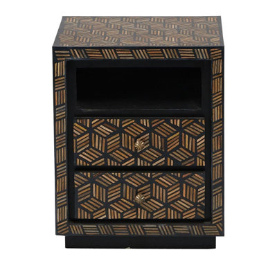 Create an account22" Unique Brown Wood Inlay Small Cabinet/Nightstand Geometric Pattern Acha Collection. Marriage of century-old techniques, traditional and cultural blend with modern art deco style, this visual statement piece is bold and unique, bringing warmth to a room with its brown earth tones. Handcrafted wood inlay embodies a natural sheen that adds instant luxury to any space. The wood inlay is a decorative technique that consists of inserting small pieces of bone into a pattern. Handmade and crafted to the highest specifications, the art of wood inlay has its origins in the royal palaces of Rajasthan, India. This intriguing art is unique to India. The intricate and timeless art of wood inlay is a tradition that has been handed down through generations. Our artisans then painstakingly carve the intricate detail in relief style-the void areas are filled with resin-some exposed wood is painted black and the result is sealed with a water-resistant lacquer. Any imperfections are not considered faults rather the nature of a handcrafted natural product. 22" Unique Brown Wood Inlay Accent Cabinet/Nightstand Geometric Pattern Acha features a Slim design perfect for narrow spaces and smaller rooms Brown wood inlay in resin over solid mango wood.Assembly Required: No, this stunning wood inlay double dresser ships fully assembled. Make it a full set with matching items in this collection, sold separately. Diligently hand-made by our craftsmen and women in India. Product Care: Wipe clean with a damp cloth; Dry dust with a soft cloth or microfiber cloth, do not use furniture polish. Structurally solid and can be used in both residential and commercial spaces. Please Note: The grain, texture, and tone of this hand-crafted furniture will vary from piece to piece. The natural characteristics such as knots, grain patterns, cracks, and color variations enhance the unique handmade appearance. But these small imperfections are natural and will not compromise the structural integrity of your piece. Since each piece is handmade, each piece will be unique and beautiful in its own way. Our furniture collection features time-honored techniques and top-quality materials. Each piece tells a story of tradition and modernity, starring globally-inspired practices and unsurpassed craftsmanship. Our intensive process begins with freehand drawings carefully sketched onto the wood. Disclaimer: Photo may slightly differ from actual item in terms of color/finish due to the lighting during photo shoot or the monitor's display.