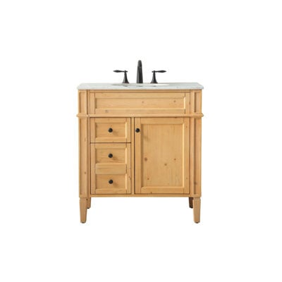Create an accountWith its marble countertop and picture-frame paneling, this freestanding single vanity set is a traditional choice for your bathroom. It has a solid and engineered wood base that rests on four tapered legs. A right-hand cabinet door opens up to reveal two shelves for your towels and cleaning supplies, while two functional drawers on the left are great for toiletries and other bathroom essentials. The countertop stretches 32" long in a Carrara white tone with subtle veining. It includes a round porcelain undermount sink, with a faucet sold separately. Some assembly is required, with an opening in the back for hassle-free installation.